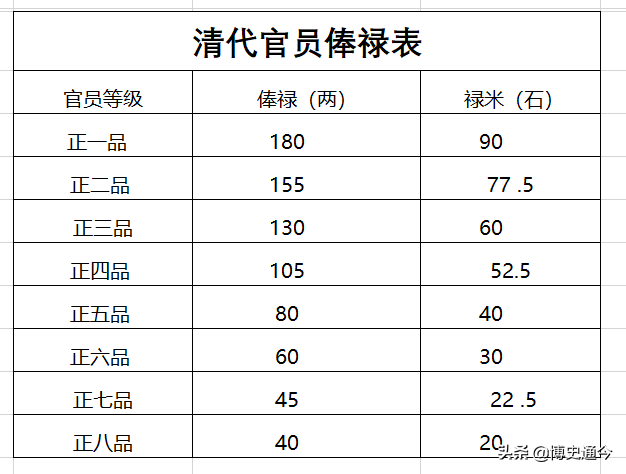 中国历史上不同时期,官员的工资待遇各不相同。其中,宋朝的官员工资最高,汉、唐次之。明朝时期,因为明太祖朱元璋出身贫寒,从小的生活环境让朱元璋觉得“凡官皆贪”,因此大幅压低官员的俸禄。清承明制,官员的工资并不高。根据艾永明《清朝文官制度》中介绍,清朝正一品官员,一年的俸禄仅为180两,平均每个月15两。而七品官员,一年俸禄45两,平均每月不足4两。为方便理解,小编将清朝官员的俸禄制成表格: