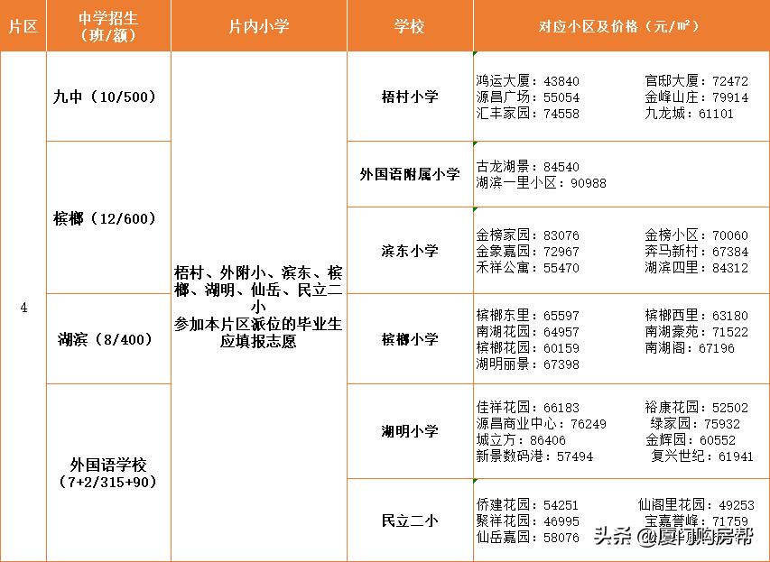 外附小、滨东小学、槟榔小学都是非常好的小学,其中外附小的学区房高达8.5~9万/㎡,而梧村小学、湖明小学、仙岳小学、民立二小都是普通小学,这4所小学的学区房价格相对低一些,但梧村小学近年也还不错,如果想买这边学区房的也可以考虑。