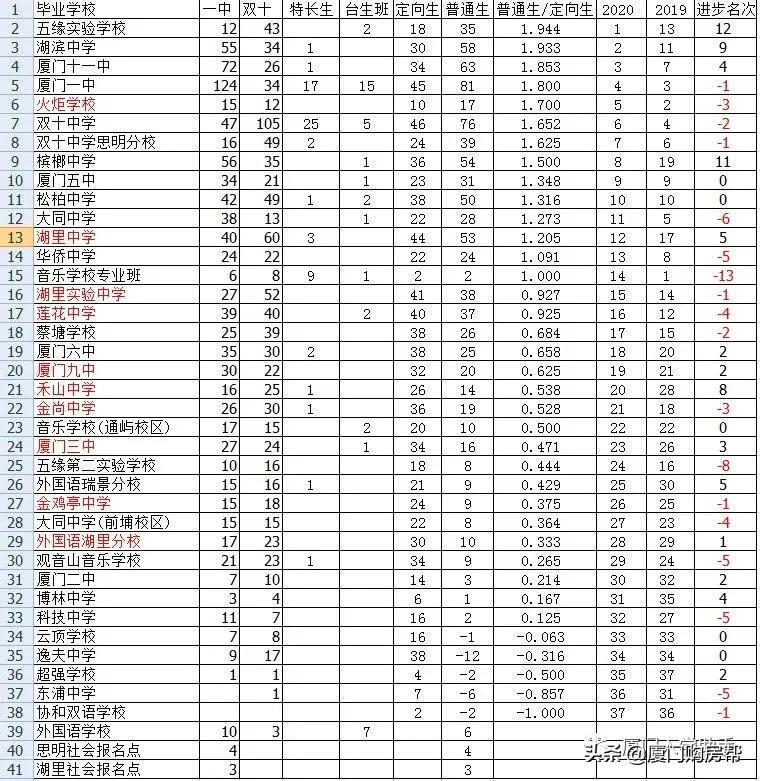 小编从@厦门入学助手 看到了一份关于2020年厦门中考厦门一中和双十中学的录取名单,看看今年厦门岛内各个初中中考成绩的好坏。统计结果如下:
