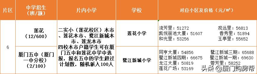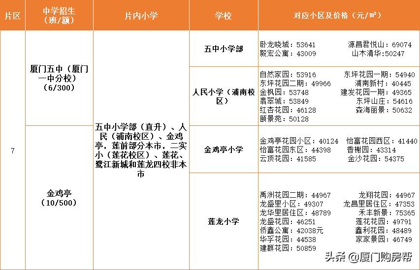 第7学区内有厦门五中和金鸡亭中学,五中相对好一点,金鸡亭中学较为普通,买学区房如果要看的话就看看厦门五中划片的学区房就好,尤其是可以直升的五中小学部。这片区房价均在4~5万/㎡。