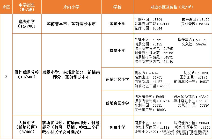 第8片区有逸夫中学、厦门外国语学校瑞景分校、大同中学,瑞景外国语学校、大同中学(前埔校区)这两所学校还算不错。其中,如果考虑买学区房的,可以考虑下前埔南区小学和北区小学的学区房,教学质量还是不错的。而如果考虑生活品质的话,瑞景公园这边的房子也是可以考虑的。(有传言接下来这个片区的学区可能会有惊喜哦)