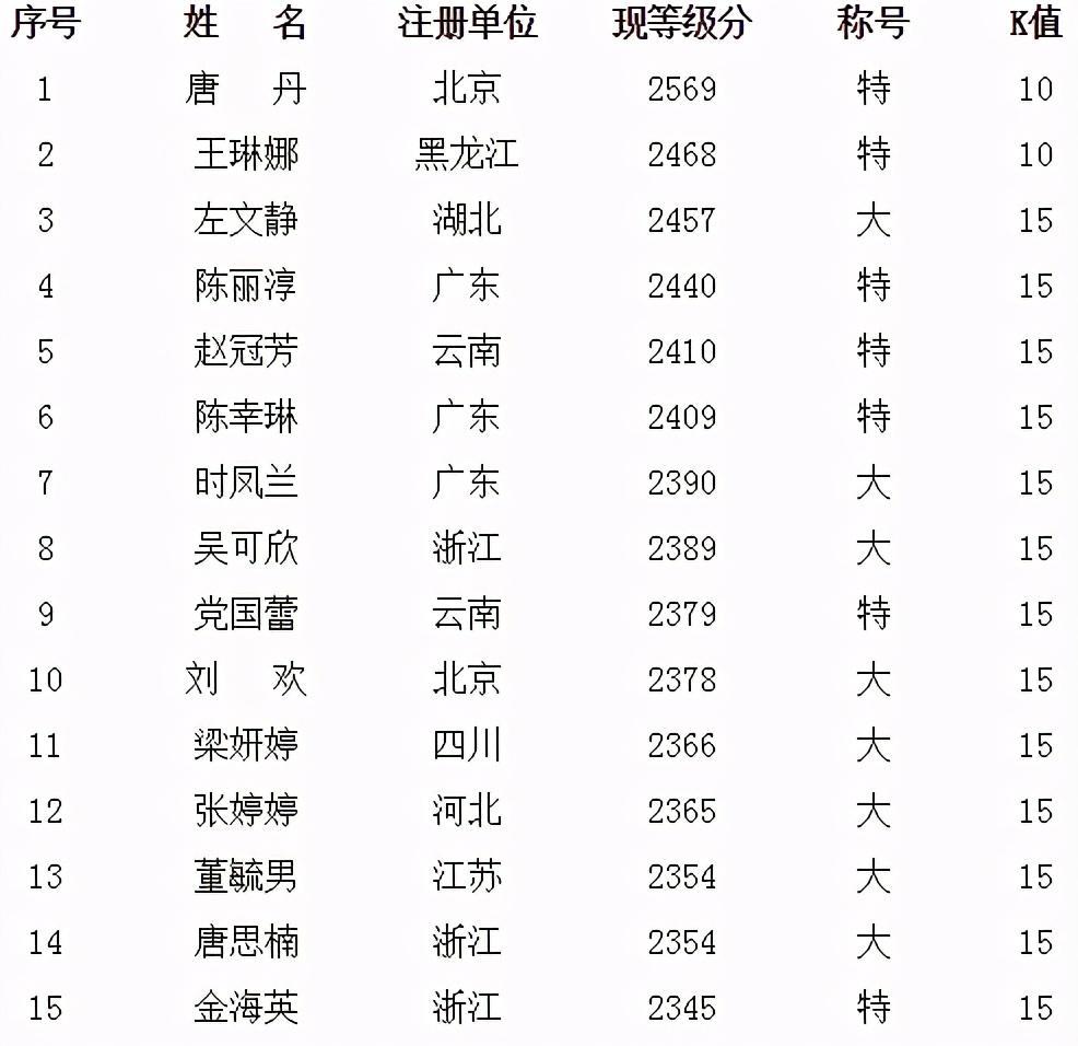 2021年下半年的象棋等级分榜,已经出炉,女子等级分排名表上,象棋女王、超级丹、九冠王,女子象棋第一人唐丹,以2569分,仍高居榜首。