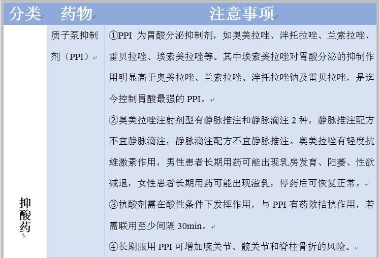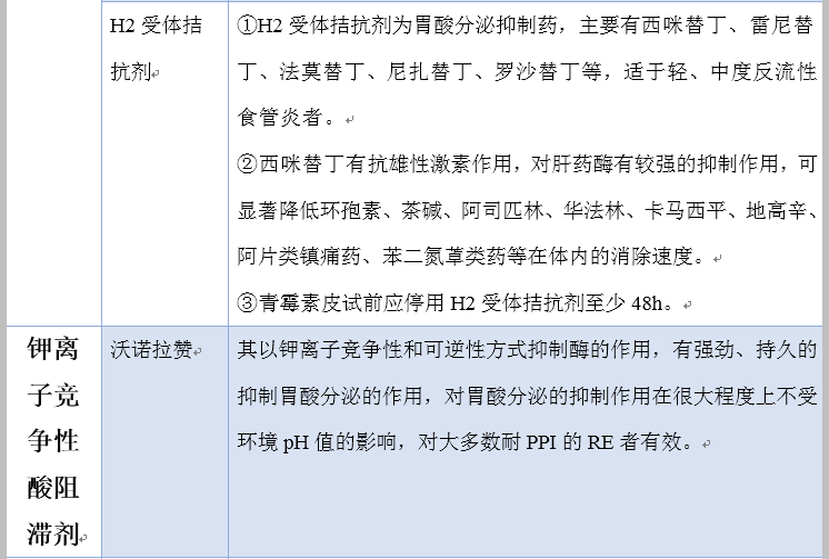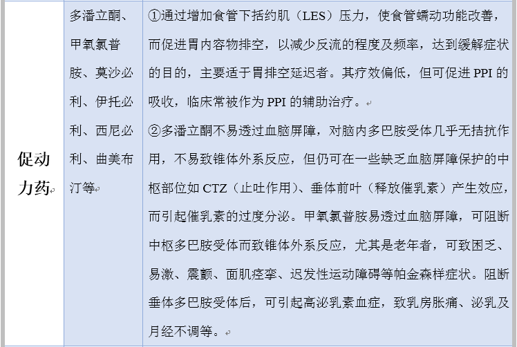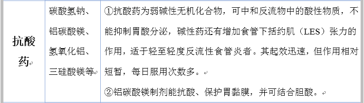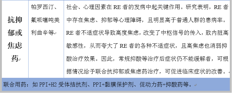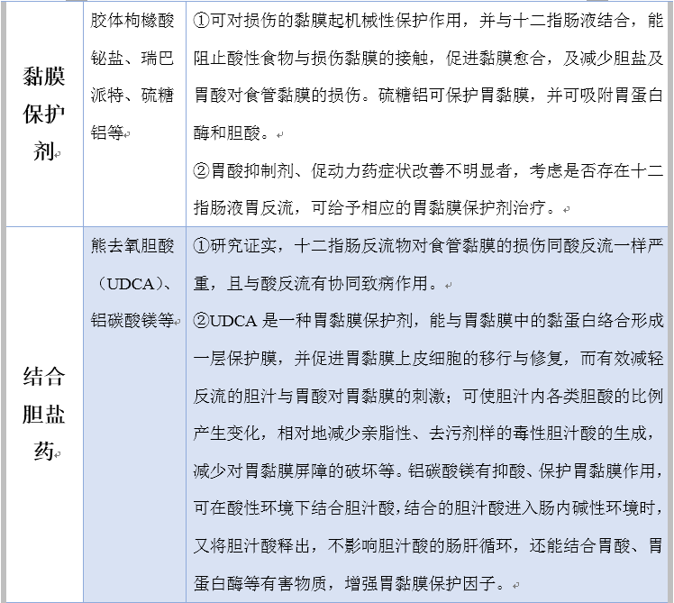其治疗药物主要有抑酸药、抗酸药、促动力药、黏膜保护剂、结合胆盐药、抗抑郁或焦虑药等。下面是各药物的归纳总结,见表1,如下:
