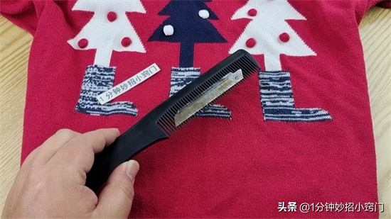 4.现在,我们把小工具斜放在衣服的上面,把有刀片的位置摆放在下面,顺着一个方向来刮除毛球,这样稍微刮一会,衣服上面的毛球就可以轻松被清理下来了,而且清理下来的毛球,都会附着在梳子的两面,这样我们收拾的时候,也会比较方便。