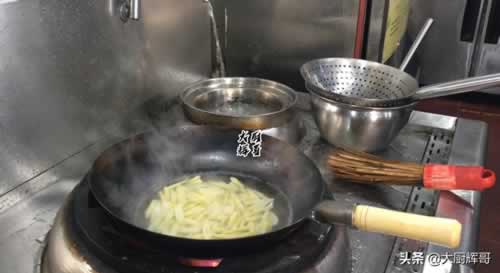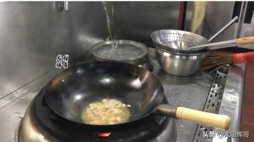 4、炒锅上火烧热放入少许色拉油,放入肉片煸炒至变色。烹入少许料酒去腥,翻炒均匀。