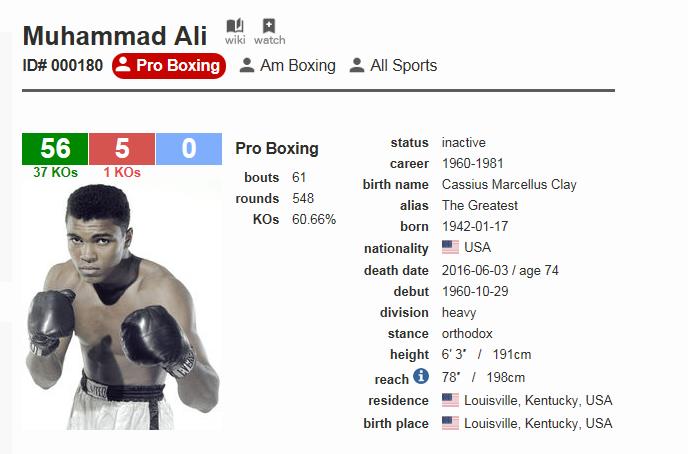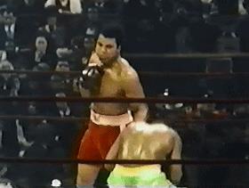 拳王阿里1942年出生,1964年击败魔王利斯顿获得了重量级冠军。年仅22岁。1964-1967年一直卫冕,后来因反越战被吊销执照,赋闲在家,1970年复出胜了2场,1971年败给时任拳王弗雷泽,从此又踏上征途,一直到1974年击败福尔曼,重获世界拳王。