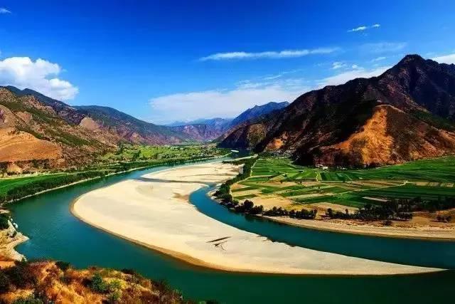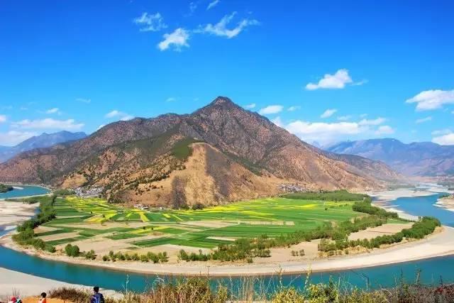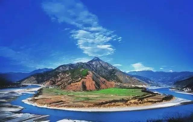 从丽江乘车西行约70公里,长江第一湾的神韵就展现在眼前了。金沙江犹如一条轻轻拂动的绸带,从青色的群山间飘然而下。两岸墨绿色的护堤林和碧绿的稻田为她镶上两条深淡相间的花边,更增添了她的魅力。