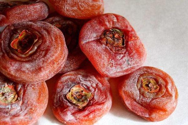 柿饼是黄色成熟柿子削皮后风干挤压成型。柿霜是柿饼表面的白霜,为稀有的柿子葡萄糖结晶。柿霜可搭配川贝一起煮来喝,对老烟枪的咳嗽,有润肺之效。柿饼两块切碎后,与鸡肉炖煮,有润肺作用。