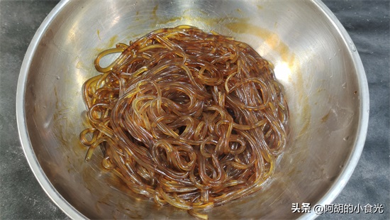 3.粉条可以提前加老抽上色:炒豆芽动作要快,火要大,为了缩短调味调色时间,我们可以将粉条提前上色,为了防止粉条结坨,还要少淋一点食用油进去拌匀。