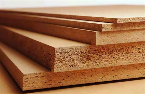 是用废弃木材打碎颗粒或杂木打碎的颗粒加上胶水在高温下压制而成的板材