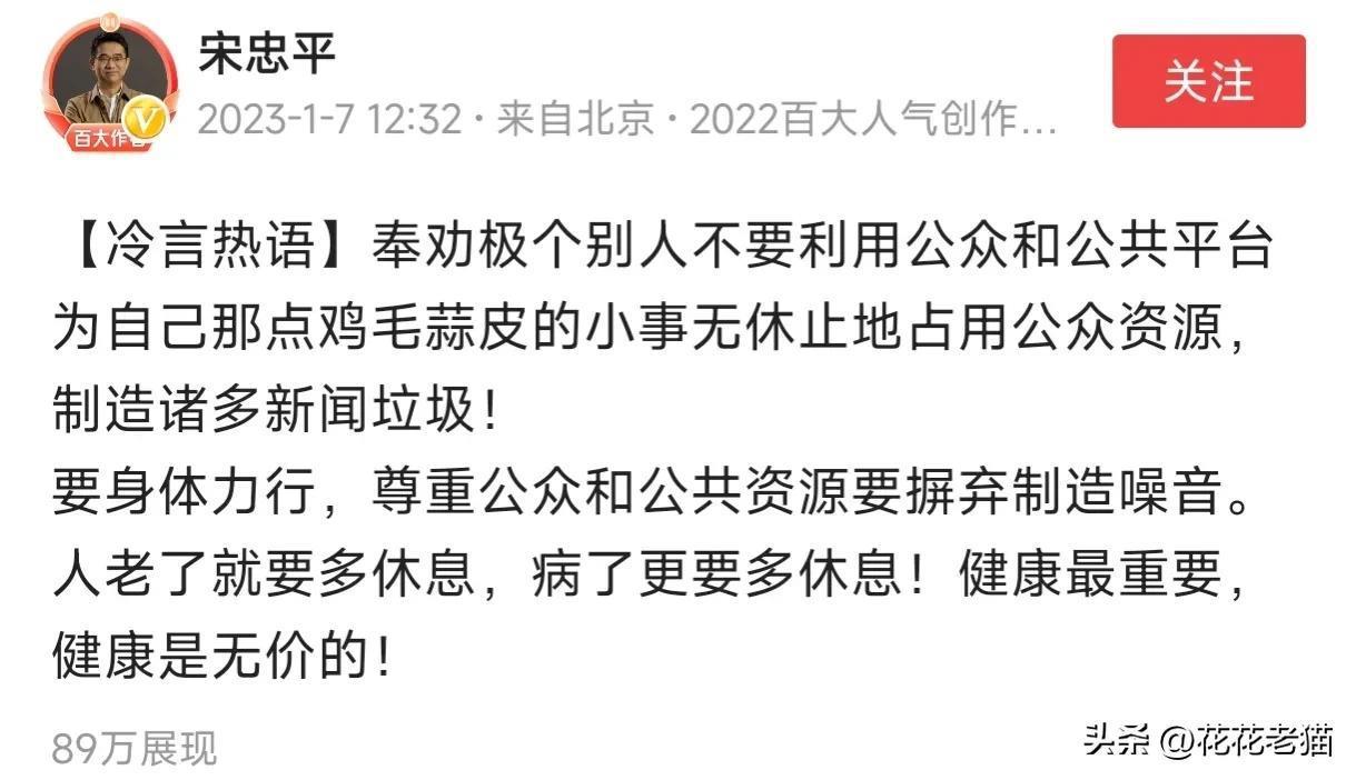 著名评论员、军事专家宋忠平发文表示,奉劝极个别的人不要因为鸡毛蒜皮的小事无休止的占用公共资源,制造垃圾新闻,要身体量行,要尊重公共资源摒弃制造噪音,人老了要多休息,病了更要多休息。看宋忠平的发文不提名带姓的,到底说的是谁呢?底下评论区有说是胡锡进,有说是司马南。网友也是一头雾水。可以确认的是:最近生病影响力大的两个人物就是胡锡进和司马南,岁数也都是老年人的标准。