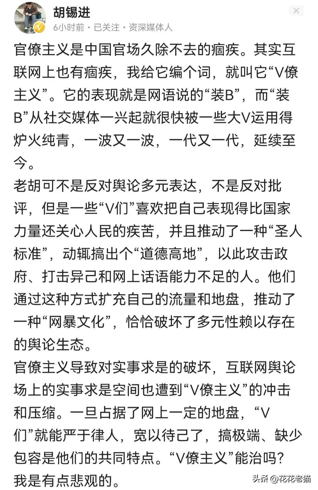 宋忠平发文随后,深夜中,胡锡进却发了一篇文章,感觉这是胡锡进对号入座吧!胡锡进表示一些v们在“装B”,喜欢自己搞出个“道德高地”以“圣人的标准”打击异己。严于律人,宽以待己。这是典型的“v僚主义”。胡锡进发文具体指向宋忠平的发文没有?看不出来!但是宋忠平发文后,胡锡进紧接着发文,措辞严厉非常少见。难道现在的网络大咖们都开始暗讽了?毕竟微博禁言事件后,大家都收敛很多。