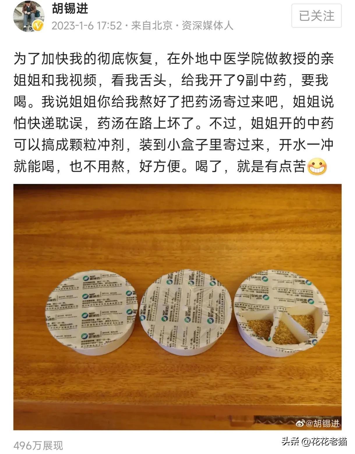 胡锡进自从确诊新冠后,大概12天还没有好利索,近日又在服用中药调理。从来没有耽误过胡锡进的发文,可见胡锡进精力还是十分旺盛的。