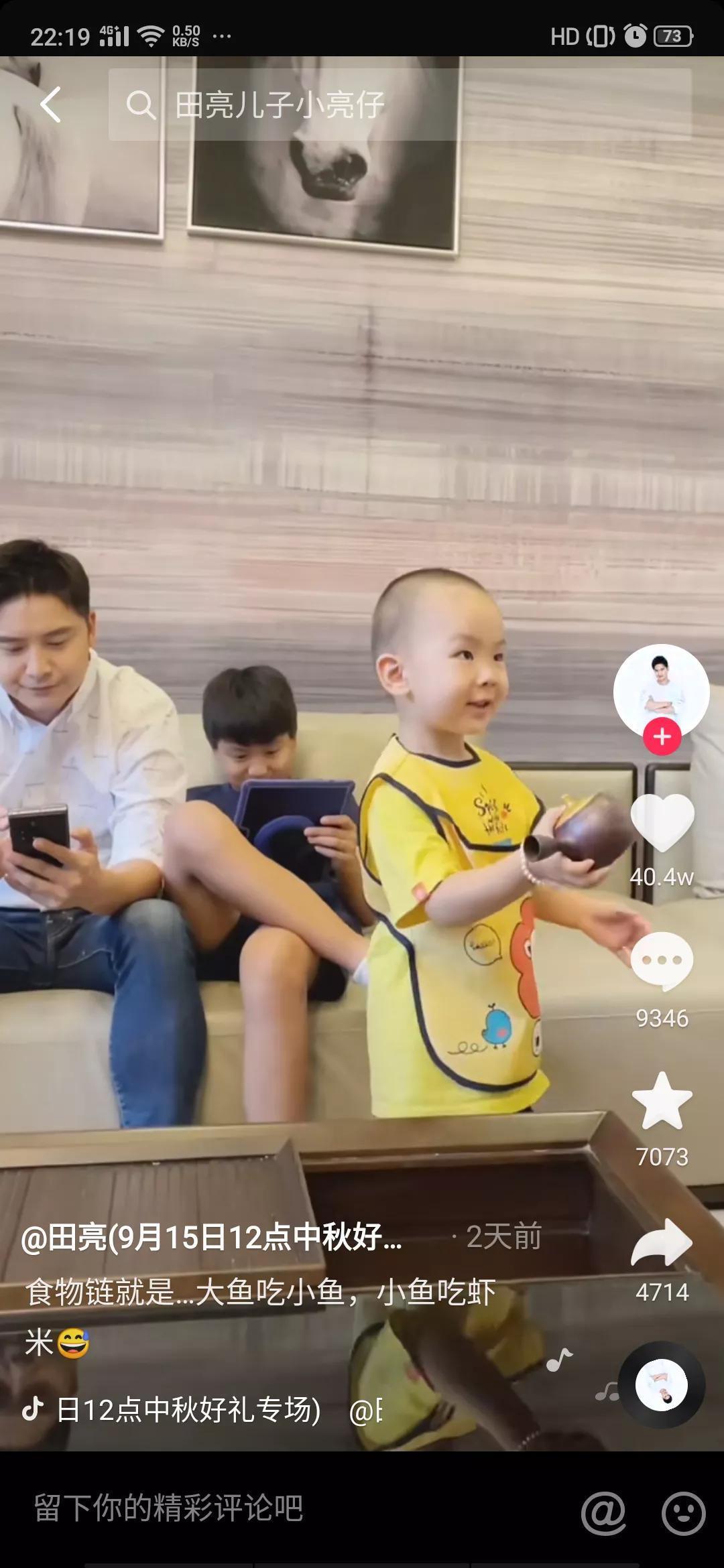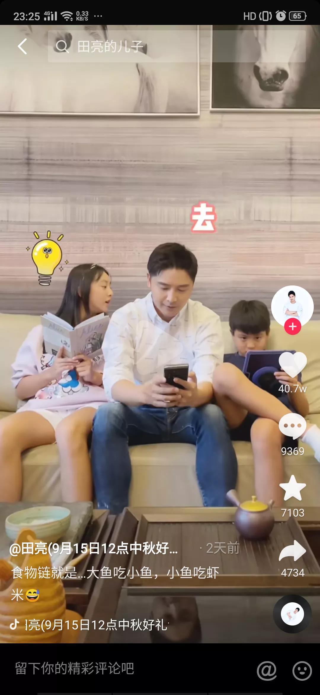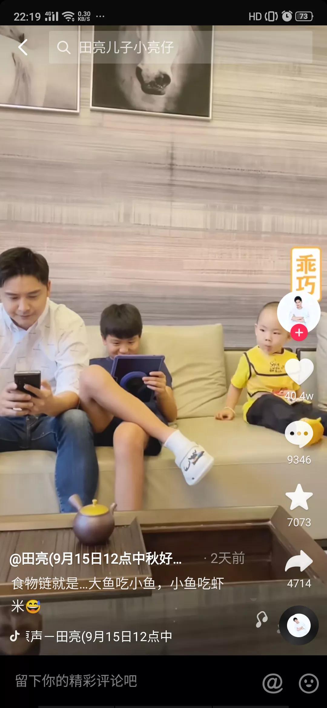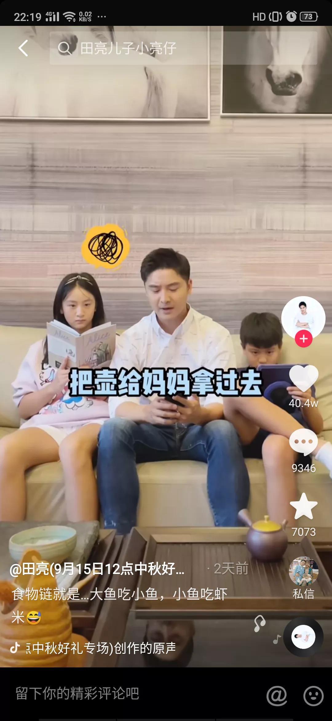视频中田亮与他的的一双儿女坐在沙发上,田亮坐在位于C位的中间,他的儿女紧挨着坐在他左右两侧,女儿森蝶坐在右侧认真的看着书,儿子小亮仔坐在田亮左侧俏皮的翘着二郎腿玩着平板;三个人即使就那么安静的坐着也让人移不开眼睛呀,毕竟这高颜值在这里。此时响起来妈妈叶一茜的声音:“亮亮,帮我把茶几上的茶壶拿过来”
