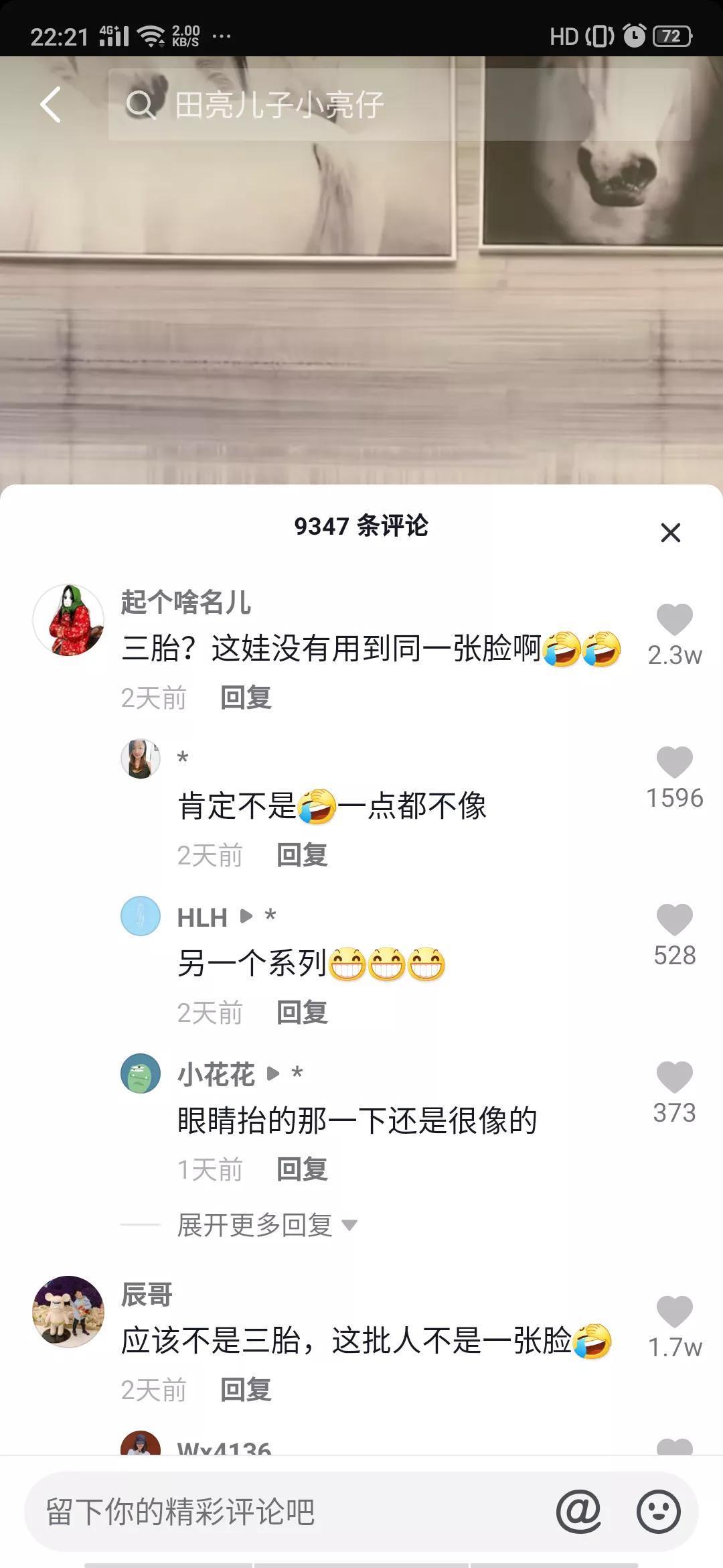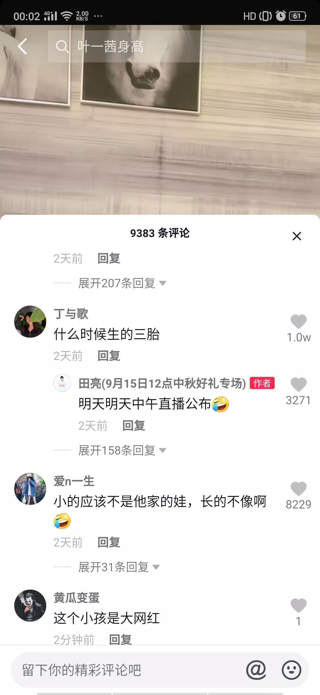 从小男孩爬沙发以及蹒跚的小碎步可以目测出小男孩大概2岁左右。小家伙的出现引发网友热议,按照视频拍摄的剧情以及小亮仔对小家伙的态度来推断,小男孩有可能是家中的第三个宝贝。这时网友就炸开了锅纷纷发出质疑声:“什么时候生的三胎”“这小的谁家的”,更多的网友鉴于“老三”的颜值是不信的:“小的应该不是他家的娃,长的不像啊” “三胎?这娃没有用到同一张脸”还有网友直接问:“亮亮 这小孩是不是借邻居家的”对于网友的质疑,田亮也没有做出明确回复,只是说到:明天明天中午直播公布。