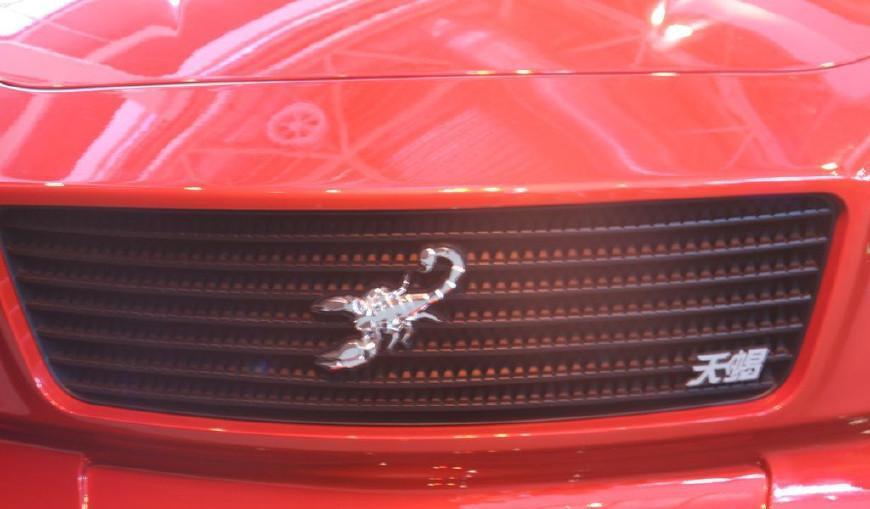 进气格栅的特写,蝎子LOGO很清楚了,右下角还有“天蝎”两个小字。