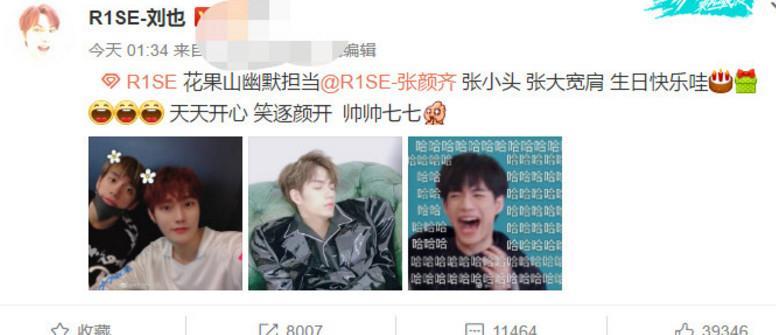 所有成员都已经及时晒照送祝福了,刘也晒了合照,调侃张颜齐为张小头。