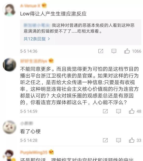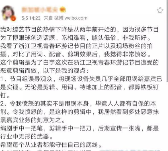 网友为综艺节目“作恶”发声时,曾这样说编剧手中一支笔,剪辑手中一把刀,后期宣传一张嘴,都是行业中无形的武器。希望每个从业者都能守住自己的底线。此时不发声,我便是默认了这样的恶。无论综艺的基调有多娱乐欢脱,沉下心来做节目应当成为从业者的共识,而不是一味为了追求热度,炮制爆点,不惜颠倒黑白。