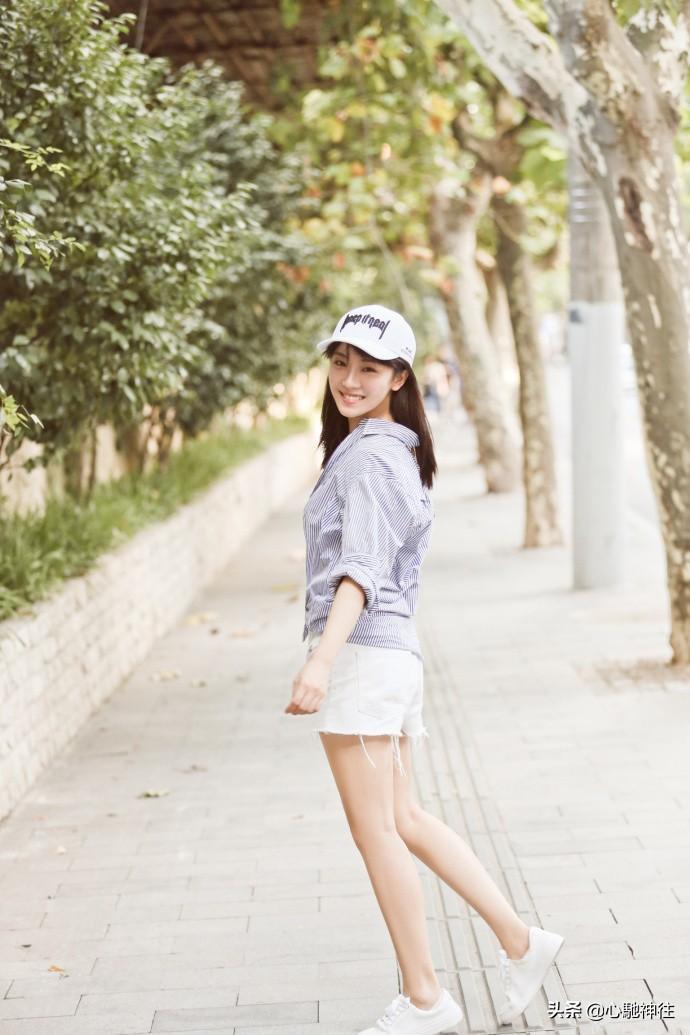 简单的白色圆领T恤搭配牛仔短裤,就很美,青春减龄。甜美的笑容更是加分。