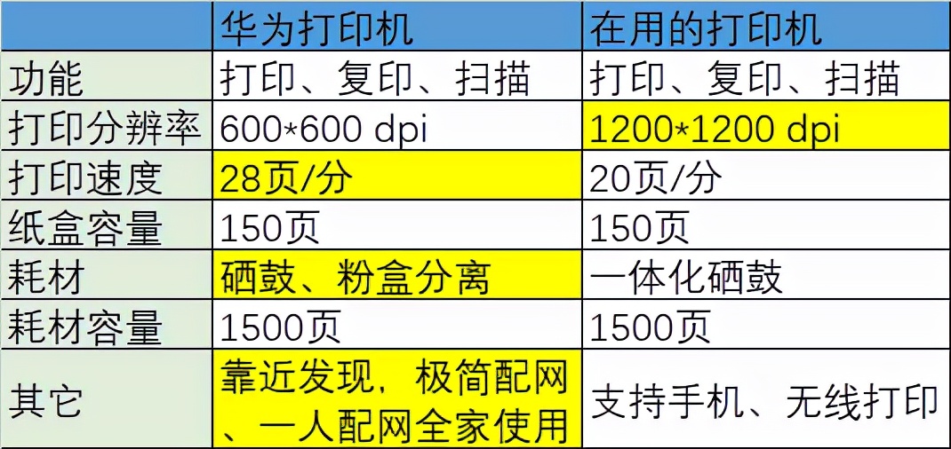 比如我现在使用的打印机其实没什么问题,但是用起来就是感觉差那么一点,比如我上面提到的那些,相信很多人都遇到过类似的,因此有时候我会发到电脑上再打。华为的这款打印机如何呢,根据发布的情况我与自己在用的打印机做了个简单对比,其实从打印机本身来说也很不错,更好的是解决了我吐槽已久的无线打印问题。