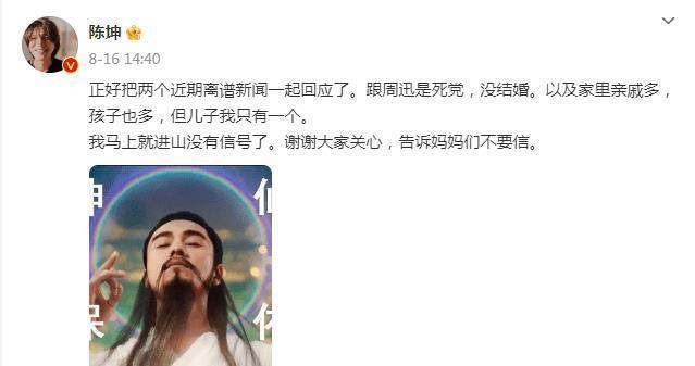 他表示与周迅只是死党,没有结婚,并且儿子只有一个。陈坤还幽默地配上了自己的表情包,展现出他风趣幽默的一面。如今,陈坤依然如往常一样为周迅庆生,