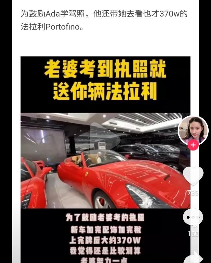 杨振兆确实很会享受,比如他在抖音中就曾经为了鼓励妻子考驾照,并声称等妻子一旦考了驾照就给她买一辆300多万的法拉利。