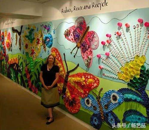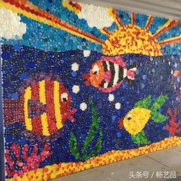 瓶盖制作而成的墙饰,小朋友们会爱死这面墙吧~