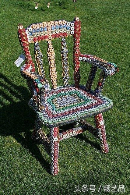 瓶盖装饰的靠背椅,好多瓶盖啊!