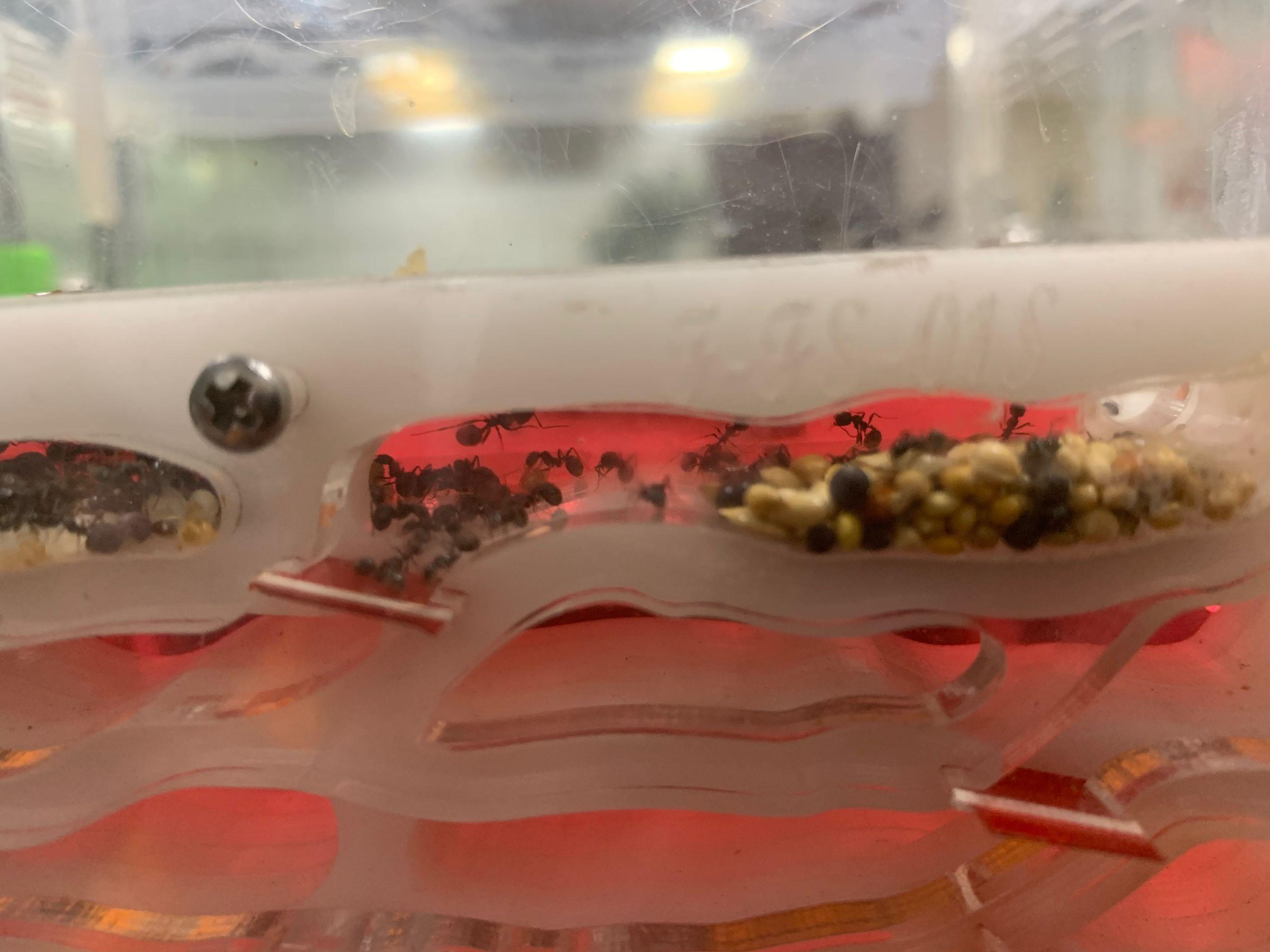 在人工饲养中,野蛮收获蚁储藏的种子总是因巢室环境不合适而发芽,这会大大影响蚁群的生存,甚至导致蚂蚁团灭。在人工巢穴里,蚂蚁栖息活动的地方和储藏种子的储藏室互相混在一起,储藏室内有足够的温度和湿度,种子容易发芽。在野外,野蛮收获蚁自己建巢时,它们会把平时栖息活动的地方跟储藏种子的储藏室分开,储藏室的位置比平时栖息活动的地方高一些,保持储藏室内处于干燥的环境,种子就不容易发芽了 。