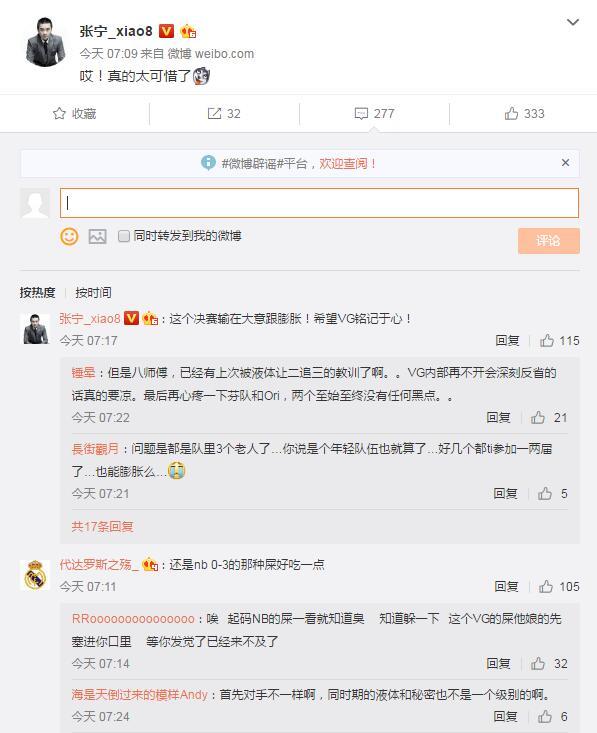 然而回顾这次总决赛,VG实在是输的很不应该,5场比赛中拿到了其中四场的前期优势,然而两度被秘密抓住机会完成绝地翻盘,最终比赛被拖入了决胜局。原本2:3屈居亚军就已经很令人遗憾,而这样拱手将冠军送给了对手更是让观众们无法释怀,很多熬夜观看比赛的水友痛心疾首,各大解说也在社交平台上表示了遗憾。