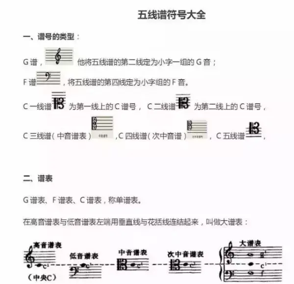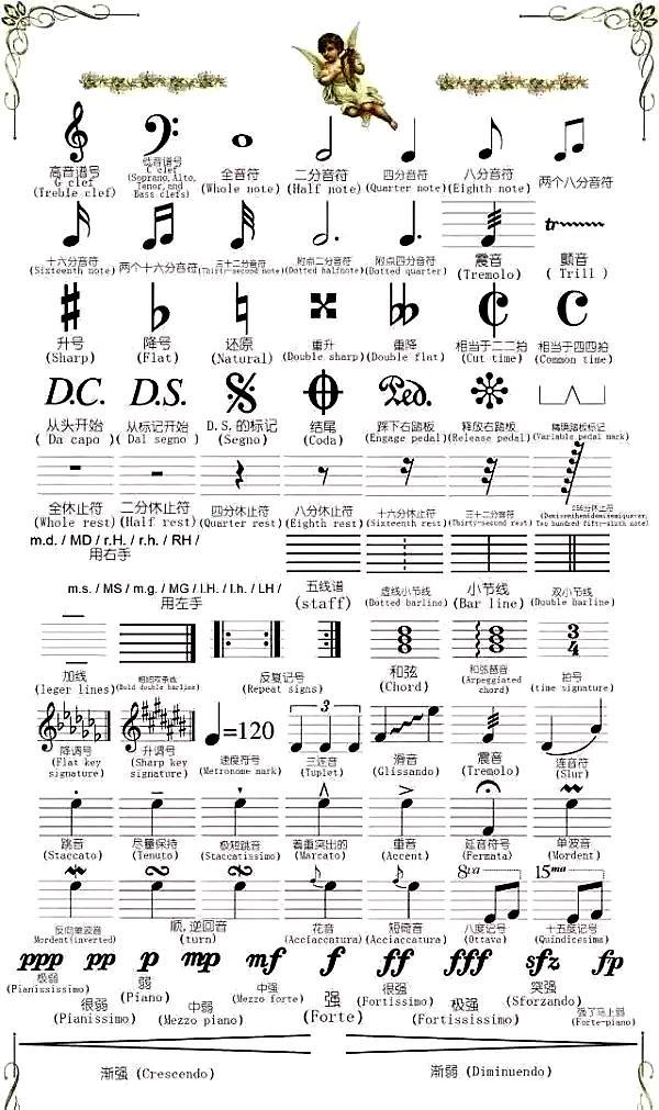 下面奉上最全五线谱符号大全,收藏它,以后遇到不认识的就翻出来看看,再也不用一页一页翻书找了~