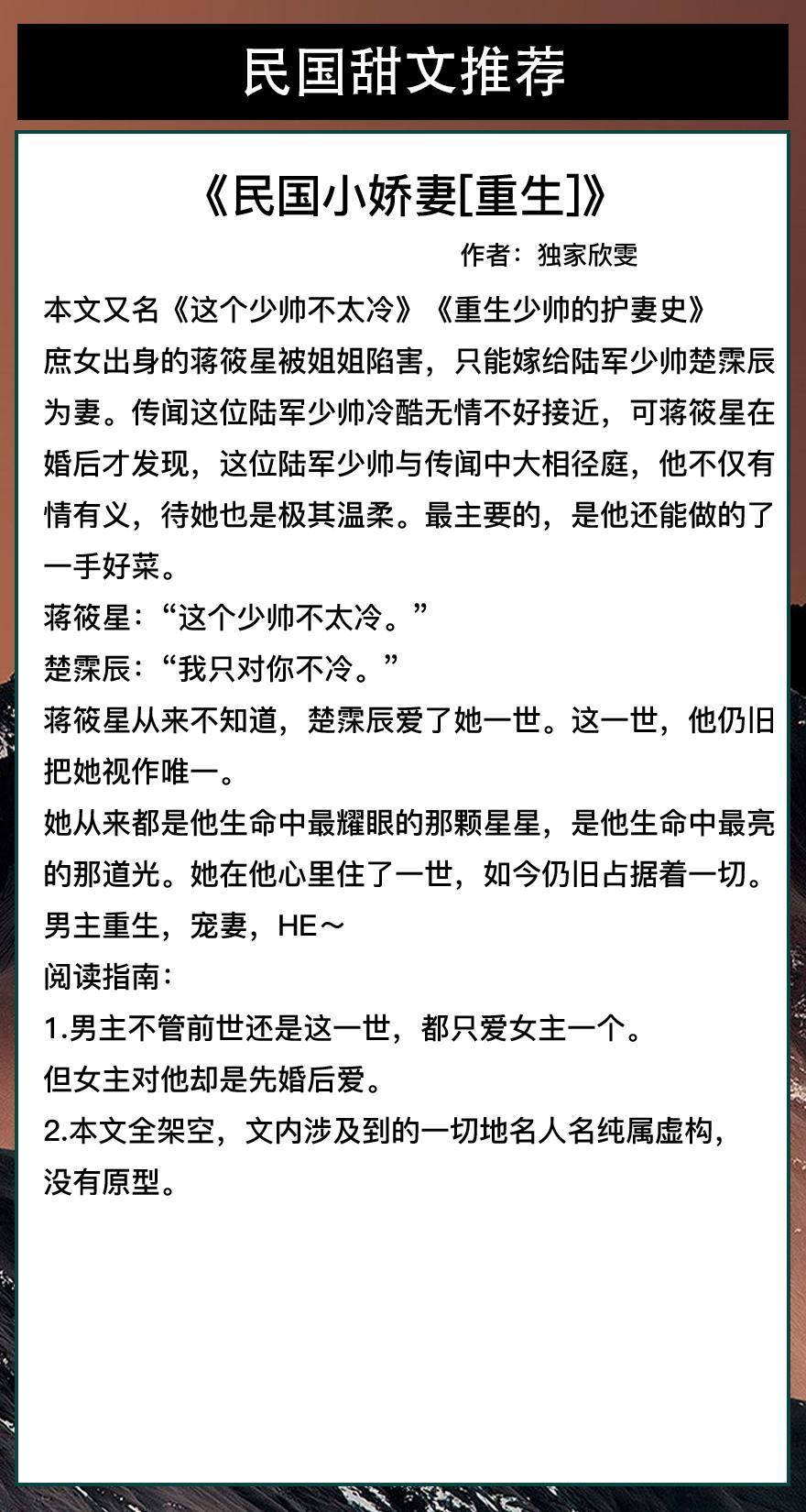 6本民国甜文推荐!重生少帅的护国爱妻史《民国小娇妻「重生」》