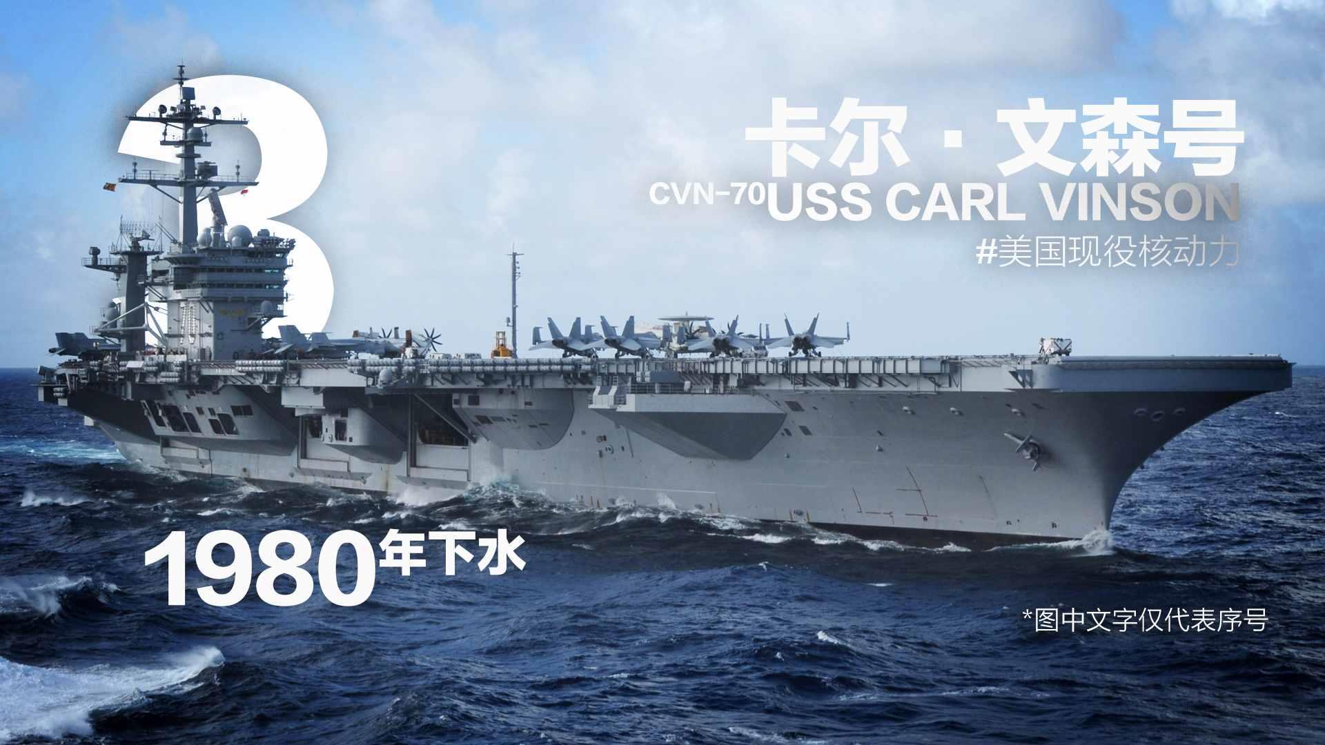 1980年下水,排水量101,300吨,全长332.8米,舷号CVN-70,最高航速31.5节,造价7亿美元
