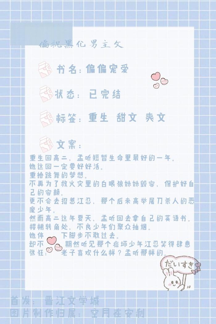 微评:藤萝为枝的很多作品都是这一类偏执男主的,我最喜欢的应该是《魔鬼的体温》,但今天咱不聊那本,聊聊《偏偏宠爱》,原名《病态宠爱》。这本的男主非传统黑化男主,他只是偏执,对女主的爱比较疯狂,给我的体验跟看黑化男主差不多。男主校霸,女主坚强小白花,喜欢的一定不要错过它!