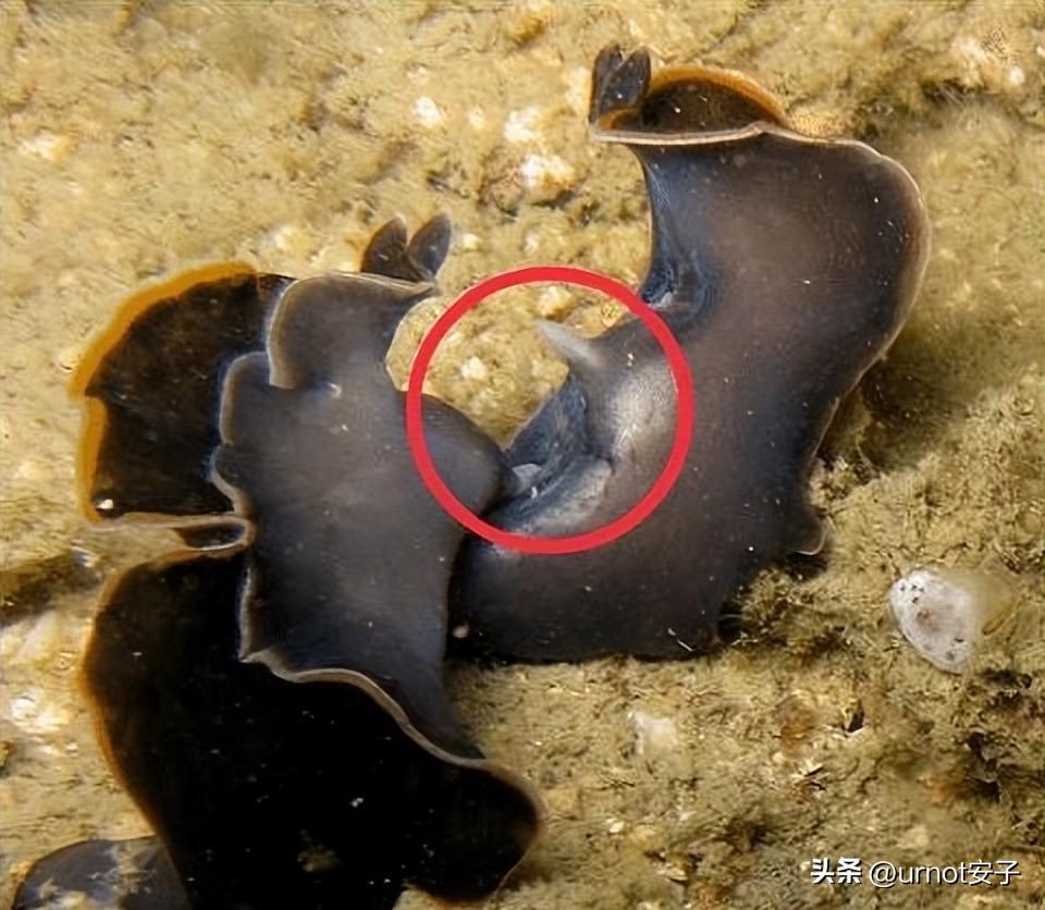 要知道每只海扁虫都有”两把剑“,这个器官形成是比较复杂的。海扁虫位于输卵管两侧有大量的圆形精巢,与每一个精巢相连的是输精管,这些输精管在海扁虫生殖腔的两侧形成了庞大的储精囊,多个储精囊共同在生殖腔前方汇集成为了雄性生殖器,也就是它的“丁丁。
