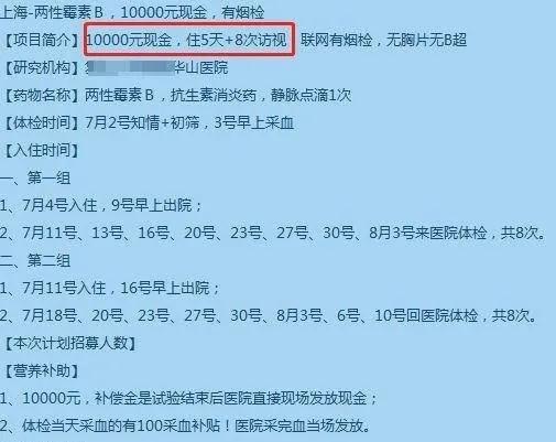 试药总的来说分为两种,一种是健康人试药,这个没有门槛,只要通过体检就能参加,一次的报酬大概在5000到2.5w不等,报酬是根据项目时长去决定的,有的项目可能两三天就能完成,但是有的却需要一星期甚至半个月。据我所了解有职业试药人还会参加那种一次两百到三百天,一次项目报酬20w左右的大项目。另外一种叫做患者试药,顾名思义就是根据患者所患的病开发出来的新药需要有人进行临床试药,一次报酬大概在6000到3w不等。