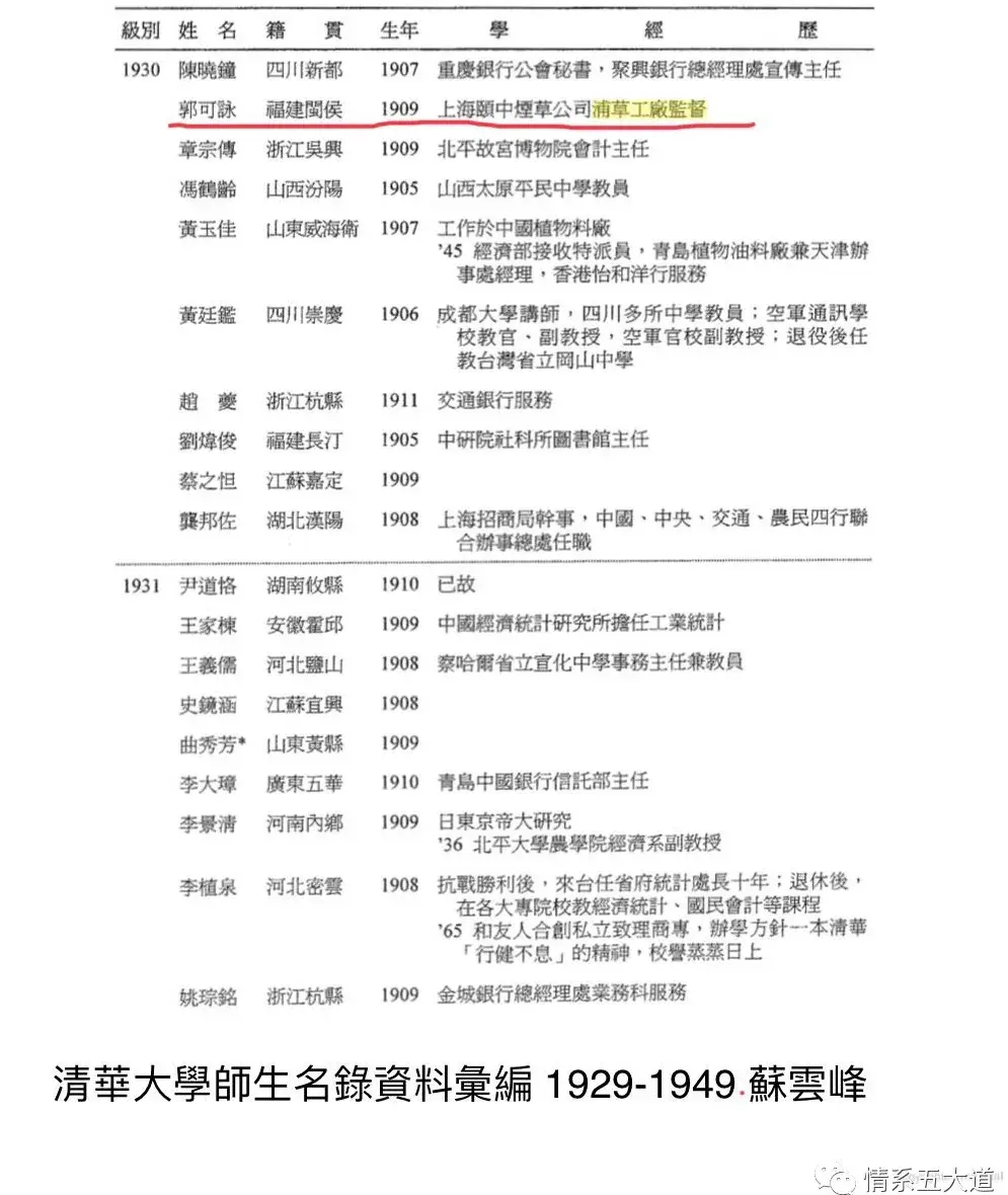 郭莹父亲郭可咏清华大学名录(网络图片)
