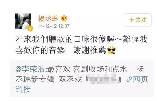 14年的12月,李荣浩曾在微博上明确的表达喜欢听杨丞琳的歌,并推荐了她新的专辑。然后杨丞琳随即也回复他:“看来我们听歌的口味很像哦,难怪我喜欢你的音乐!谢谢推荐。”