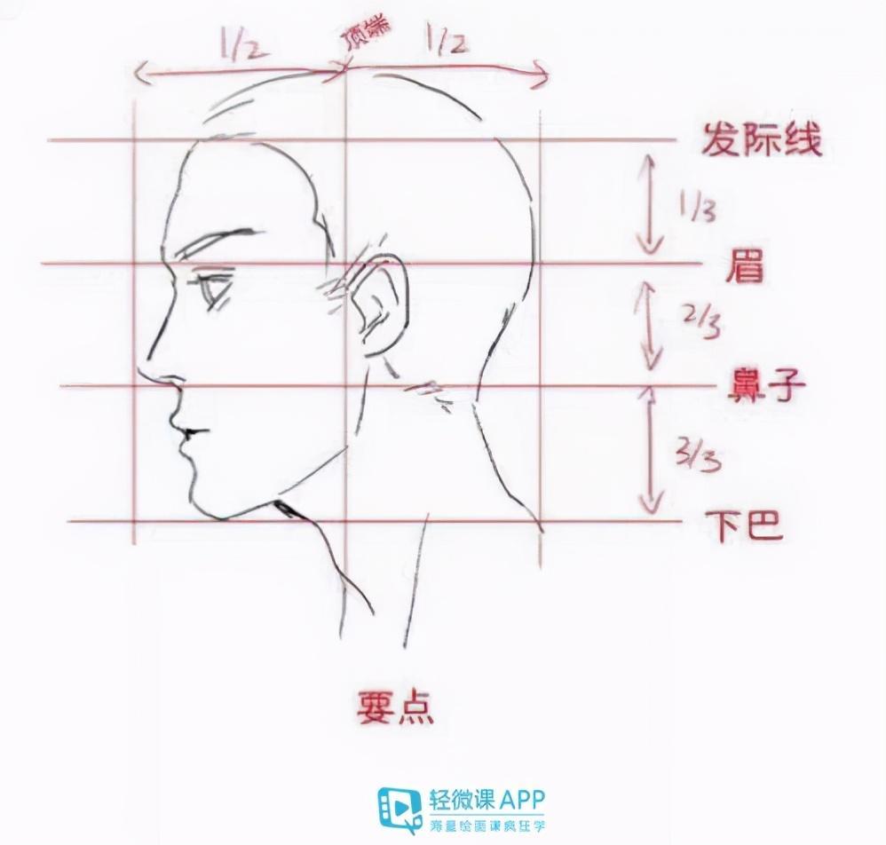 咱们这次画的是少女初长成,有些插画风格的侧脸,所以,我们把眼睛放在中心线以下,这样看起来会萌哒哒一点。这个大家去观察很多动漫就了解了,五官比例按照小孩的来画,会显得很萌。