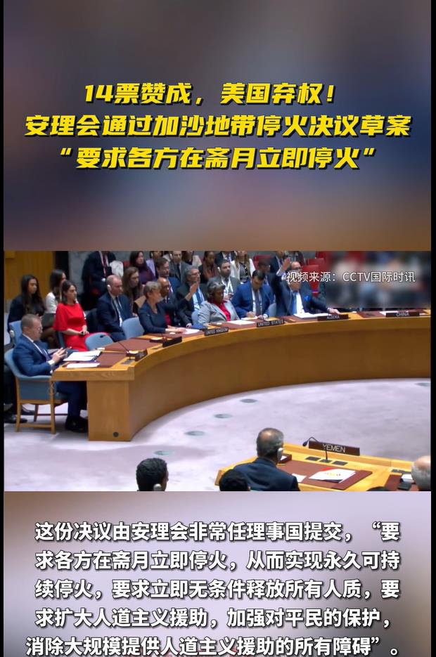 当地时间25日上午,北京时间今晚,联合国安理会表决通过一份要求立即在巴勒斯坦加沙地带实现停火的决议草案。表决结果为14票赞成,美国弃权。这是自去年10月7日以来,首次在安理会决议中明确要求停火。这份决议由安理会非常任理事国提交,“要求各方在斋月立即停火,从而实现永久可持续停火,要求立即无条件释放所有人质,要求扩大人道主义援助,加强对平民的保护,消除大规模提供人道主义援助的所有障碍”