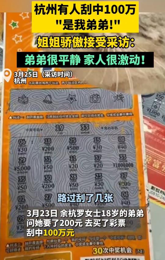 国内大事件二:杭州姐姐给了弟弟200元刮中100万姐姐骄傲接受采访