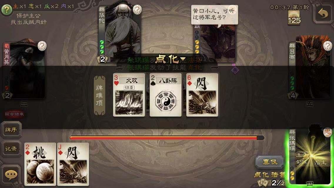 “紫微”控判定——能改成黑桃5或者红桃5,前者配合自己的技能“玉清”,还可以改乐不思蜀判定和兵粮寸断判定,厉害的来一下雷击,也可以帮助张角,最差改一下八卦阵嘛。后者保证自己和队友过一次乐不思蜀。这个技能妥妥的是继承了爸爸的血脉。“后土”来急救——濒死时可以用一张手牌当桃用。似乎是华佗急救的单次对自身限定加强版,不限于红色,只能对自己用。“玉清”来加伤——这个单次技能强度又有点像许褚的裸衣,可以加一点伤害,不同的是锦囊造成的伤害也是可以的,非常的暴力,唯一的问题是需要进行一次判定,黑色才能发动,50%几率直接一起带走一个“紫微”“勾陈”来补牌——好吧,这时候又和郭嘉挂上干系。发动条件比郭嘉苛刻,但是强度比郭嘉强,“三种类型的牌各一张”确保了不会重复来杀闪。