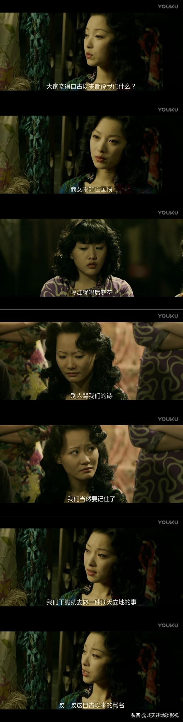 在世人的眼中,她们看上去是那么的放荡妩媚,就好比当初她们踏入教堂时那般恣意,那么一副什么人都不放在眼里心里独自快活的样子,在女学生眼里,她们更是自私自利,只图自己开心快乐的代表。其实,也只有看过影片的观众才知道,每个秦淮河女人的不易和不甘,她们也是一群有血有肉,心地善良,讲情义讲义气,爱憎分明的人,就好比一直和玉墨争头牌的红菱,在大是大非面前也英勇挺身,再说那个令人心疼的豆蔻,为了给临死的浦生弹琵琶,在回翠禧楼的时候被日军凌辱后残忍杀害。
