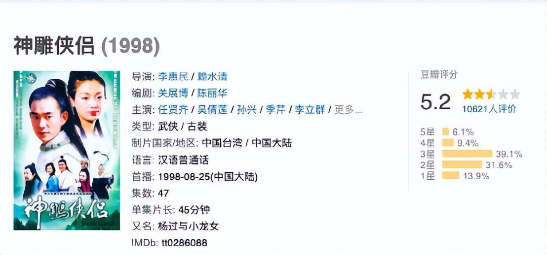 对于原作的颠覆较大,小龙女少了很多清新脱俗的气质,而任贤齐,也没有演绎出杨过的大侠风范。