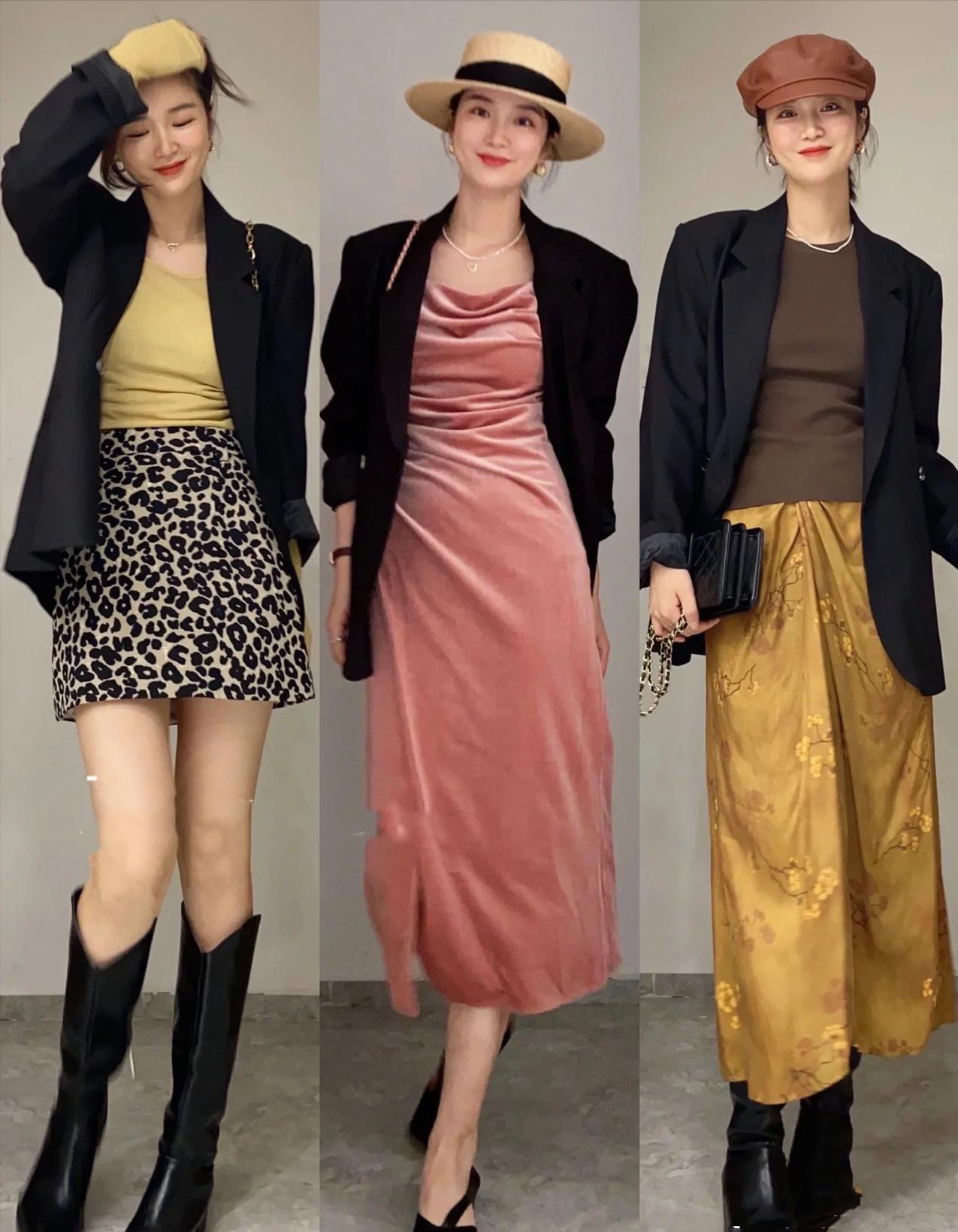 想要看起来更有女人味,可以选择风格反差大一些的裙装,比如材质柔软的缎面真丝,以微微的珠光感带来奢华高贵的气质。丝绒材质更复古典雅,用少女感的粉红色丝绒长裙搭配廓形黑西服,加以珍珠项链装饰,浪漫又高级,整个人也贵气了不少!
