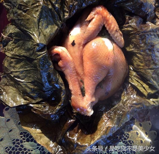 泡荷叶,加料腌制鸡,整只鸡,不要剁块,肚子洗净,可以塞土豆蘑菇,也可以塞葱姜。鸡外表用细盐擦一下,更好入味。