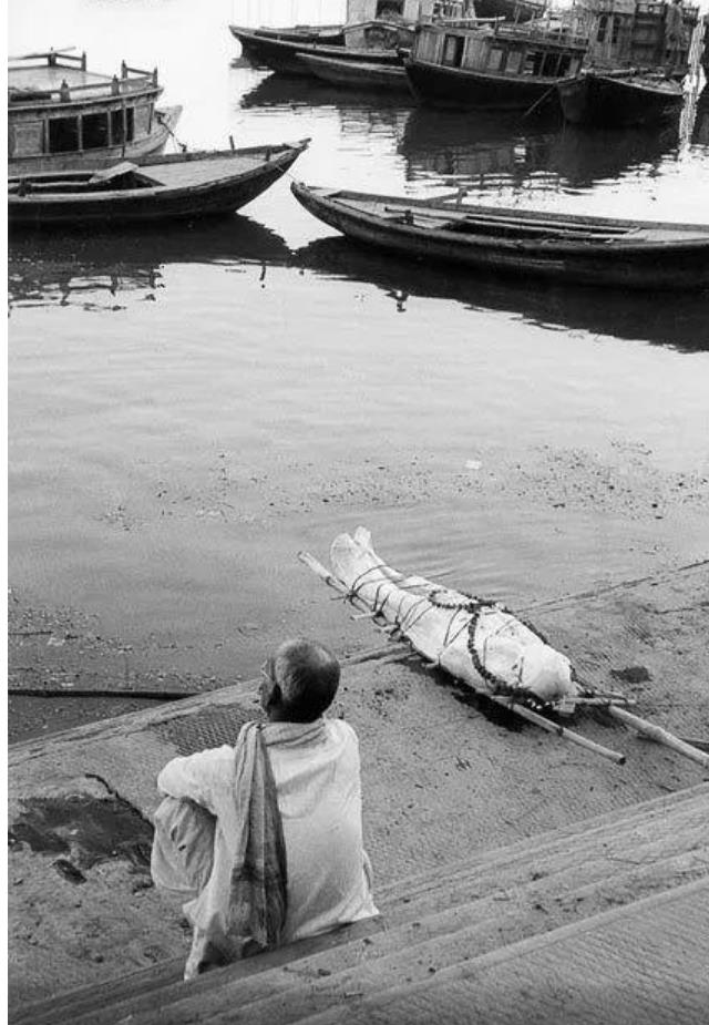 印度圣地贝纳雷斯,担架上捆绑着的是一具尸体,正准备推向恒河里进行水葬。