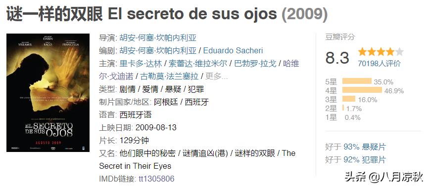 《谜一样的眼睛》由胡安·何塞·坎帕内利亚编写并导演,还获得了第82届奥斯卡金像奖。故事的大致情节虽然和别的悬疑片没什么两样,但导演想讨论的不仅是一般复仇类型的影片所探讨的罪与罚,还有故事中三个男人对爱情的态度。