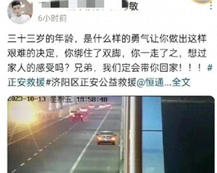 让我们把时间倒回到10月13日,当天下午六点左右,有一名男子独自驾车来到济南凤凰黄河大桥。他先将车停在路边,打开双闪警示,然后蹲下身将双脚牢牢地捆在一起。