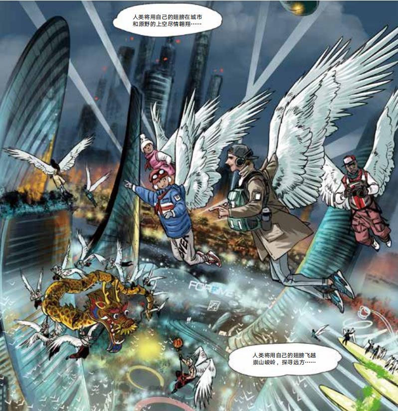 《天使时代》里,人们用自己的翅膀飞翔,飞越钢铁森林,探寻远方。